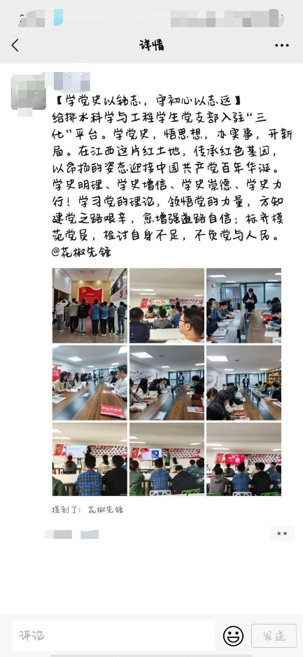 奋斗百年路,启航新征程。通过此次“三化”平台活动和“五微“内容的开展,给排水科学与工程学生党支部全体党员对党史、党章、党的精神有了更深入的了解。用党的奋斗历程和伟大成就鼓舞斗志、明确方向,用党的光荣传统和优良作风坚定信念、凝聚力量,用党的实践创造和历史经验启迪智慧、砥砺品格。以更加昂扬姿态奋力开启全面建设社会主义现代化国家新征程,以优异成绩迎接建党一百周年。