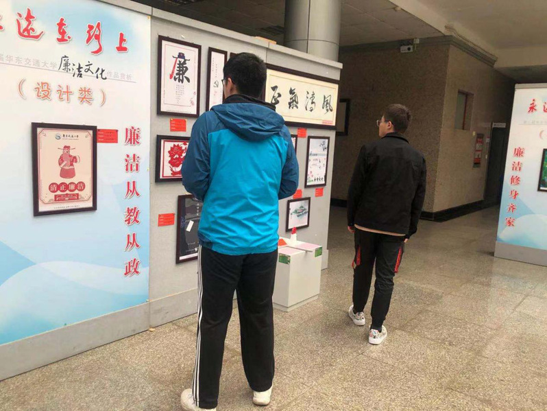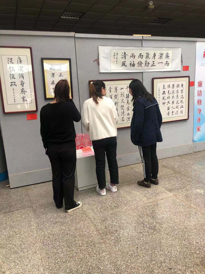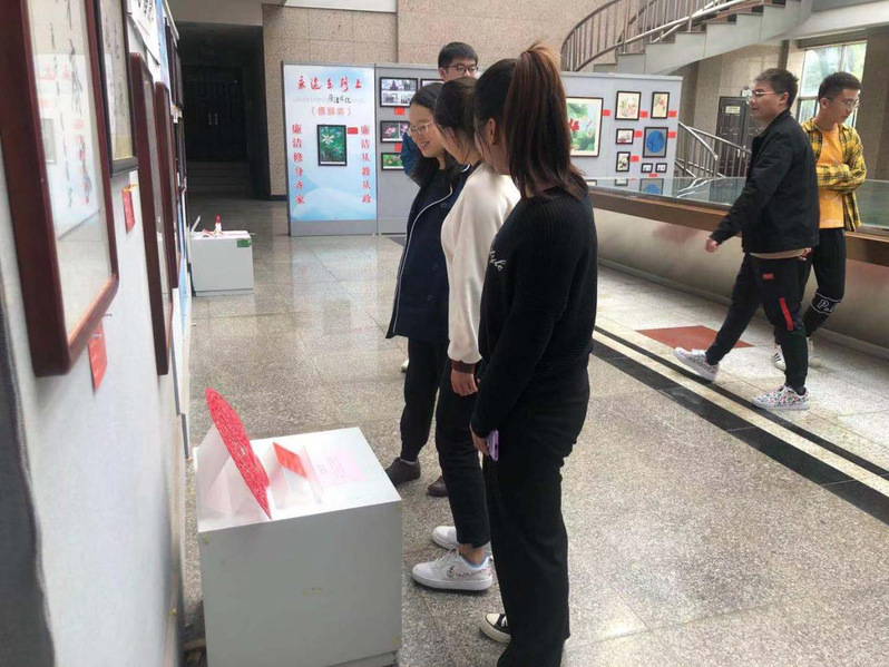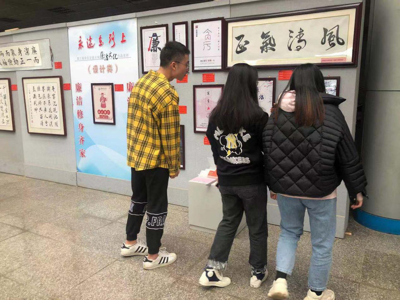 据了解,共有56幅优秀作品入选本次廉政文化作品展,都是各个学院老师同学所做并且获得了奖项。风格多样,精彩纷呈,有抒发心志的书法绘画作品,也有反映当下社会风貌的摄影作品。文化展上,大家认真观看,细细体会格言警句,还一起交流心得,感受深厚的文化底蕴,还不时驻足观赏,既受到了艺术的熏陶,又接受了一次深刻的反腐倡廉宣传教育。