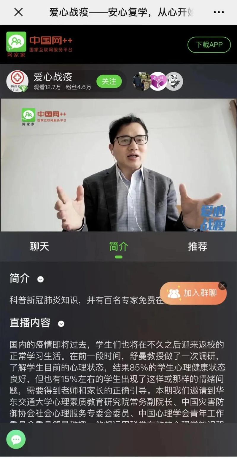 为了帮助到更多的人,舒曼充分发挥各大平台及窗口作用,他制定了《关于开展“联心抗疫”心理健康科普宣传的具体方案及实施细则》,凝聚全省心理志愿者的力量,通过开设“联心抗疫”系列网络直播讲座,将心理援助及危机干预的效果覆盖到全省各个学校,同时指导各设区市、县、区开展青少年心理健康教育辅导工作,实现了大中小学心理健康教育的全对接和全覆盖。