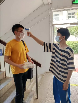 大四党员为出入楼栋学生测量体温