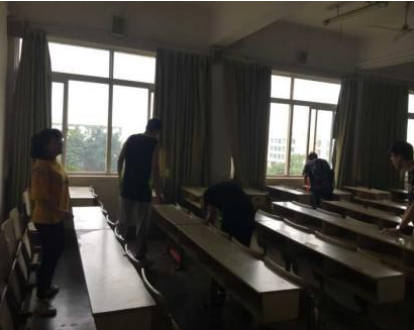 第十五组:在组长殷勤的带领下,第十五组成员针对逸夫楼的楼道卫生和教室卫生进行了一次打扫,并把黑板留下的粉笔字擦去,方便接下来上课的师生。同时,大家一起把摆放混乱的座椅摆放归位。