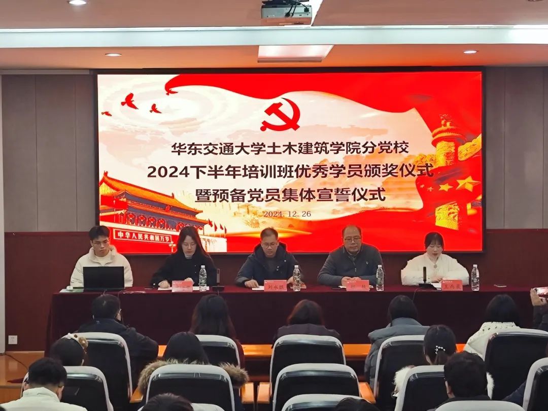 2024下半年培训班优秀学员颁奖仪式暨预备党员集体宣誓仪式在土建楼200会议室举行。院党委书记刘永胜,院党委副书记郑轶,院党委委员、党委组织员刘琦慧,各学生党支部书记,优秀学员及2024年下半年预备党员参加本次仪式,本次仪式由土建学院兼职组织员王雨晨主持。