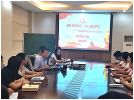(4)9月25日下午,我支部与道铁研究生支部联合开展主题教育活动,张鹏飞给研究生党员上微党课:“使命引领科研,初心成就梦想-与道铁研究生支部学生党员共勉”。研究生是高等院校、科研院所从事科学研究工作的中坚力量,张鹏飞认为:新时代科研工作者的初心和使命就是:“创新为民,科技报国”。张鹏飞通过讲述“最美奋斗者”袁隆平、黄大年等优秀科研工作者科技报国的先进事迹,勉励研究生同学将初心使命与人民幸福和国家发展结合起来,用自己的行动报效祖国。