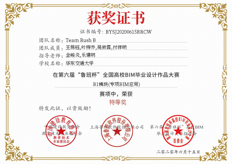 金峻炎老师和乐建明老师指导,来自工程管理专业的王栋钰、吴泉霖、付祥明、叶梓乔同学组成的“Team Rush B”团队经过和西南交通大学、中国海洋大学、兰州交通大学、云南大学等200余所高校、近500多支参赛队伍的激烈的比拼角逐,最终获得了本次大赛的特等奖并赢得了价值40000元的软件使用权。