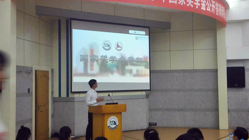 的6位候选人相继上台进行讲演。在限定的时间里,选手们或慷慨激昂,或娓娓道来,分别从学习情况、学科竞赛、社会实践、科技创新、社会工作等各个方面,以PPT作为载体来对自己的申请理由进行了陈述。选手陈述完毕后,在座的评委就相关情况对选手进行提问,同时选手根据问题进行限时答辩。全体选手在答辩环节中给现场观众带来了一场充满智慧的视听盛宴,在场的学生和老师都为他们感到骄傲和欣慰。