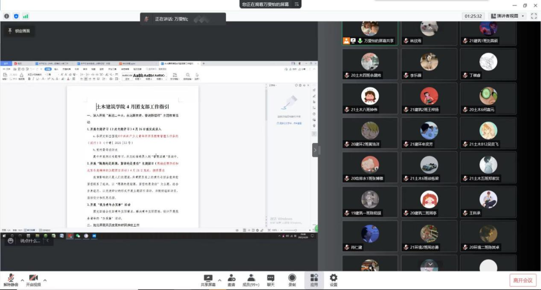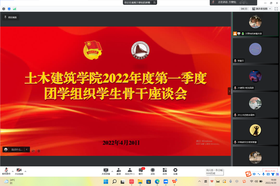 四月团支部工作进行解读与布置:一是深入开展“喜迎二十大、永远跟党走、奋进新征程”主题教育活动;二是规范开展团员发展和群团推优工作;三是持续开展“抗疫有我”志愿活动。并对全体团员青年在本次疫情防控期间积极参加志愿活动,提出表扬和感谢,希望同学们能继续贡献青春力量,服务好学校疫情防控工作。