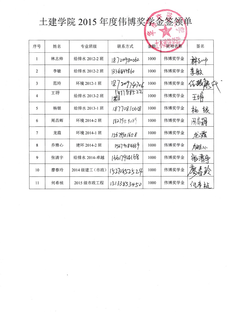 2015伟博奖学金奖金签收单