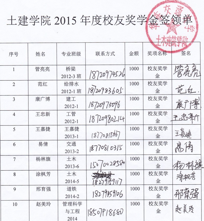 2015校友奖学金奖金签收单