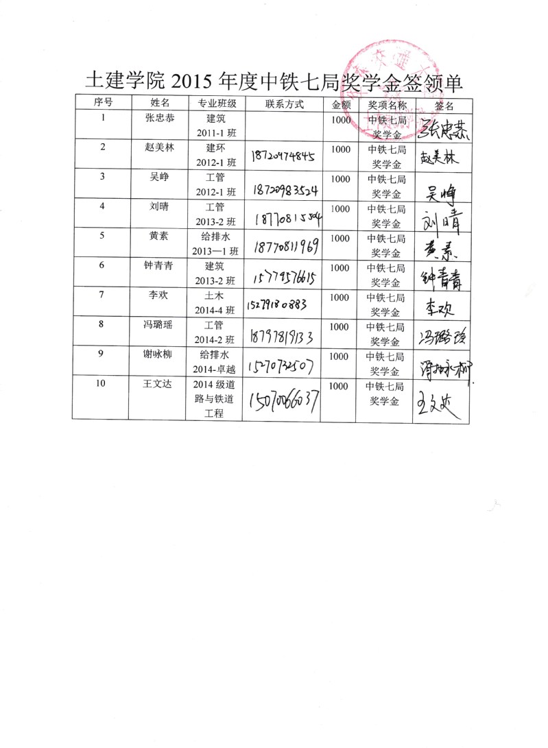 2015中铁七局奖学金奖金签收单