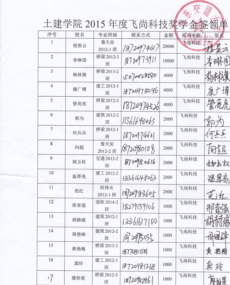 2015飞尚科技奖学金奖金签收单