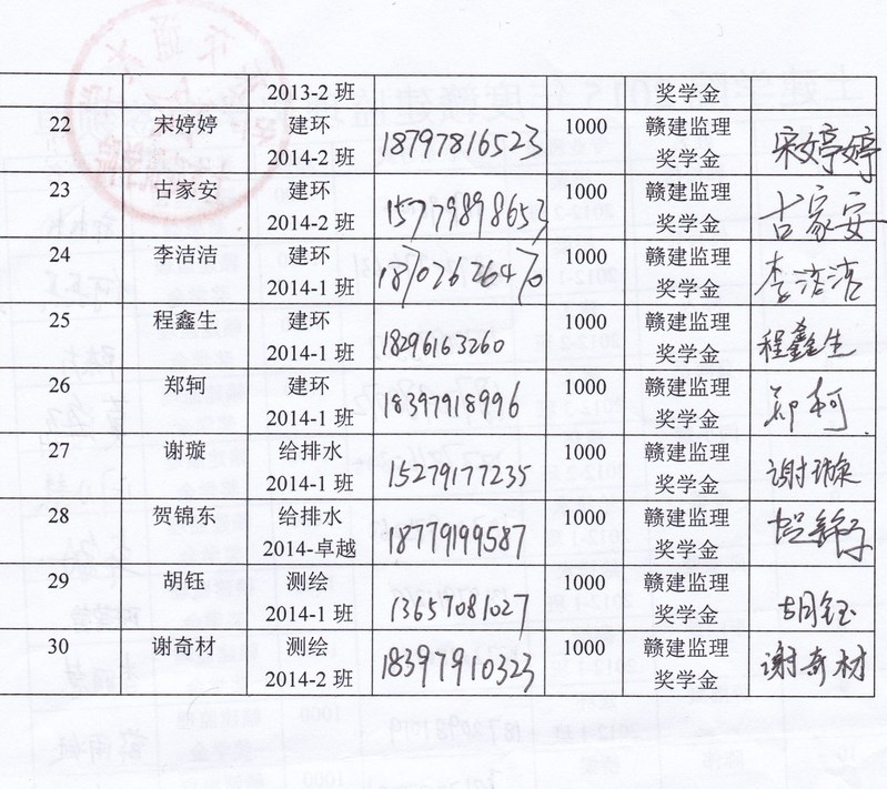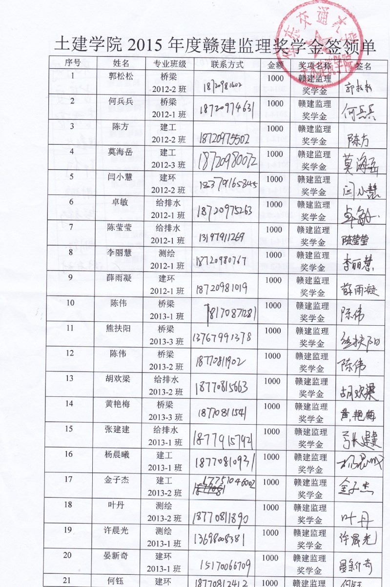 2015赣建监理奖学金奖金签收单