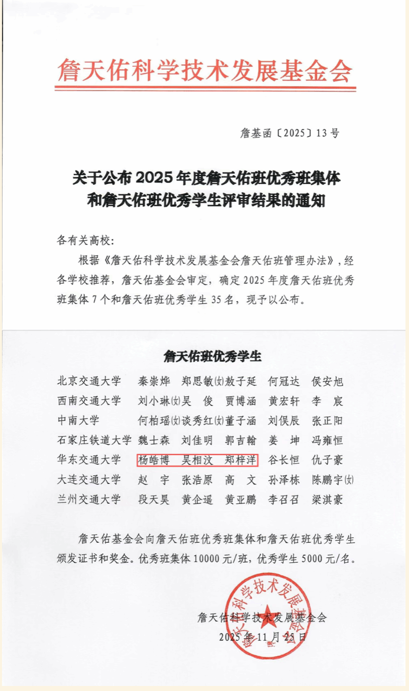 近日,经各校推荐与詹天佑科学技术发展基金会审定,91网站 杨皓博、吴相汶、郑梓洋三位同学荣获2025年度全国“詹天佑班优秀学生”称号。