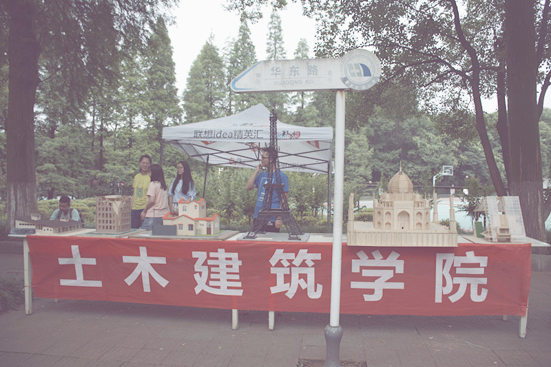 在土建学院的帐篷前,建模大赛获奖作品吸引了同学们的注意力,他们围拢在展示台前观看模型,进行咨询。土建学院志愿者们耐心解释每一个模型的制作材料、拼接过程和展示意义等等。