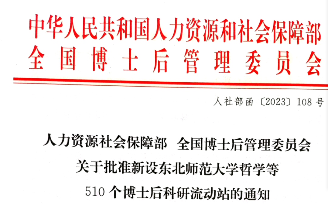 日前,人力资源和社会保障部、全国博士后管理委员会联合发函(人社部函[2023]108号)公布了2023年新设博士后科研流动站名单,91网站
