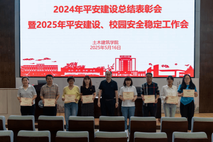 上一年,在学校党委、行政的正确领导下,全院师生员工共同努力积极主动参与平安建设,保障了校园安全稳定,为表彰先进,树立典范,进一步推动学院平安校园建设工作深入开展,陈科楼老师宣读了学院《关于表彰 2024 年度平安建设先进单位、个人、集体、寝室的决定》。副院长麻宏强为平安建设先进个人教工代表颁发了荣誉证书,副院长陈莘莘为平安建设先进单位颁发了荣誉证书。