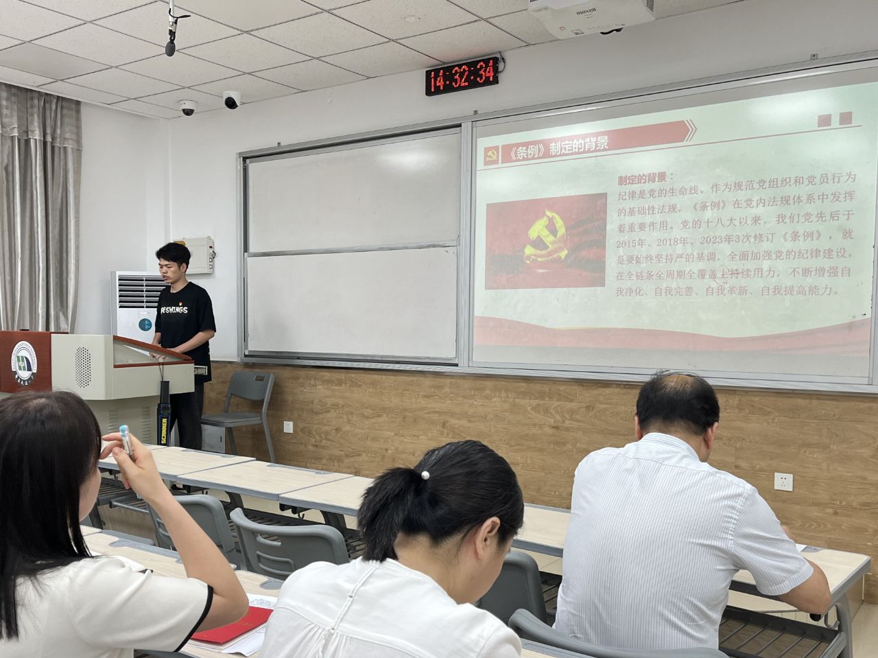 党委副书记郑轶总结,党纪学习教育是今年党建工作的重点任务,各支部书记要精心组织、扎实开展。全体党员要在思想上认识到位、行动上落实到位,自觉抓好《条例》的学习。要准确把握目标要求,突出重点,抓好警示教育,以案促学,用党规党纪校正思想和行动,真正使学习党纪的过程成为增强纪律意识、提高党性修养的过程。他还联系学生党员实际,结合学术诚信、校纪校规、健康成长等,对照《条例》的六大纪律,对存在的不足和风险点仔细分析,通报了学生教育管理中的相关案例。